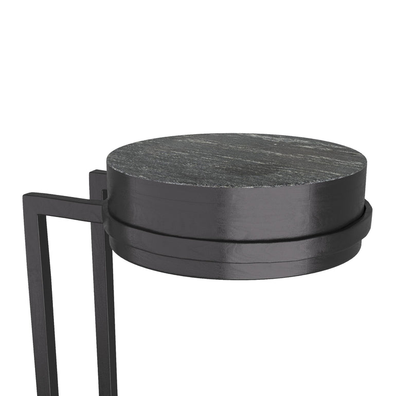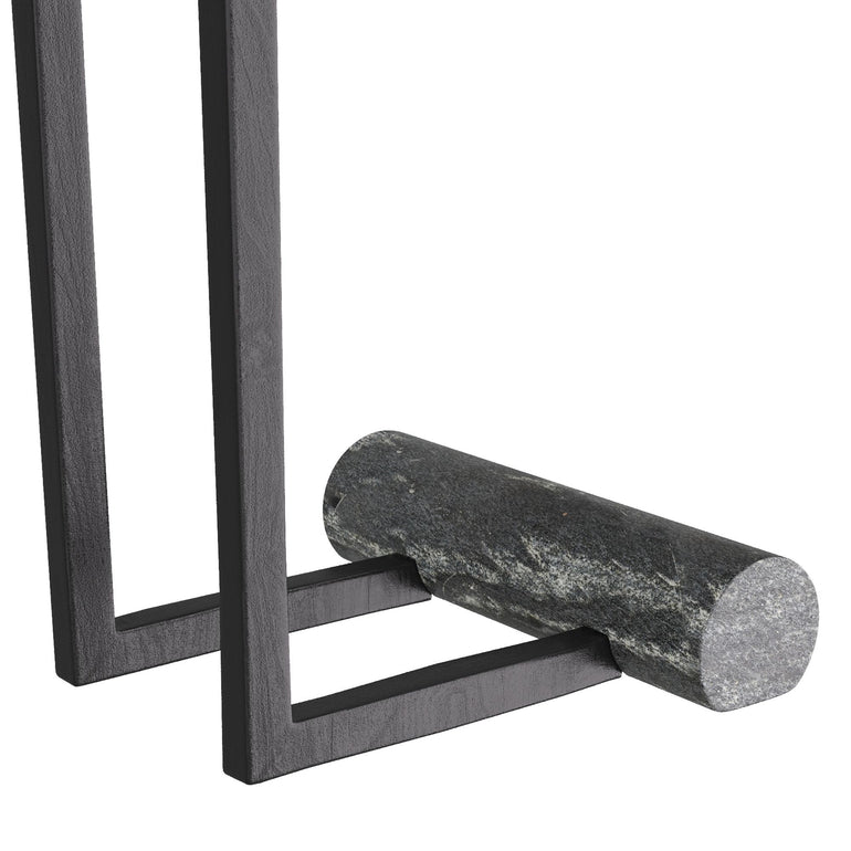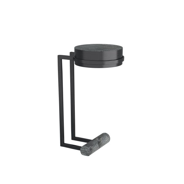 THE PLAYFUL SILHOUETTES PIONEERED BY THE MEMPHIS DESIGN MOVEMENT INFLUENCE OUR ESSENTIAL AVALOS. A ROUND TOP OF BLACK MARBLE CANTILEVERS ON BLACKENED IRON LEGS OVER A SOLID BASE OF EBONY-FINISHED OAK. MARBLE AND WOOD WILL VARY.