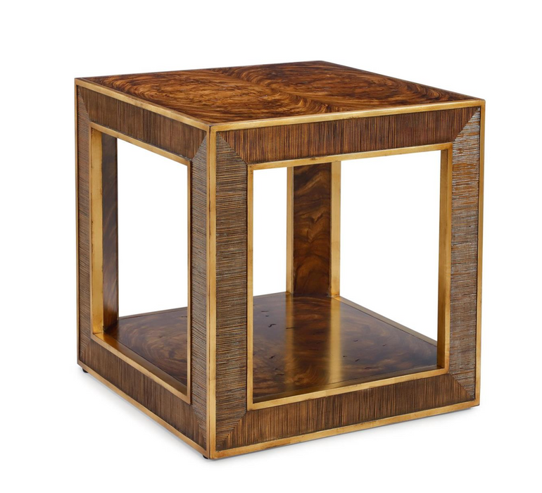 The Cadre Side Table features a sleek, geometric silhouette that brings a sense of openness to a space. Sculptural molding finished in Distressed Gold highlights striking zebralli wood grain in a Lucerne finish. Intricate texturing along the exterior sides contributes layers of visual depth, greatly enriching the sophisticated aesthetic.