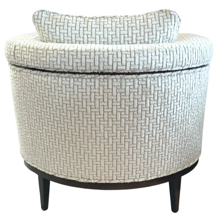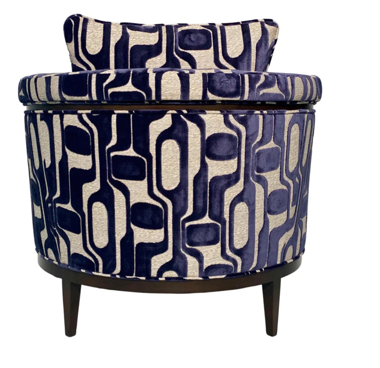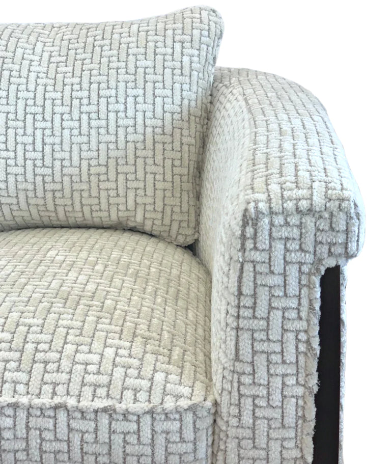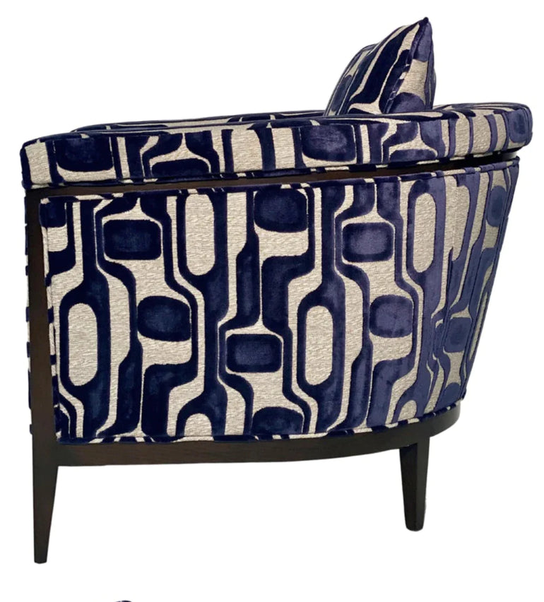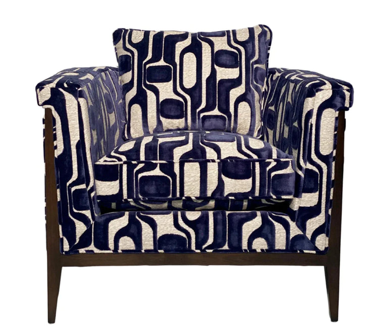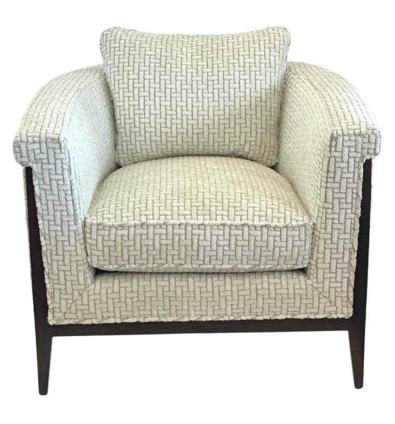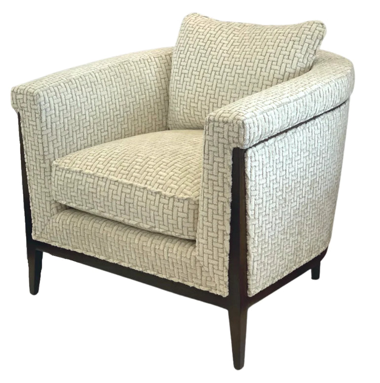 This Deco inspired tub chair features square arms with a boxed loose seat cushion and knife edge back pillow. The frame is accented with exposed Beech wood outlining the base, bottom of arms, and outsides of arms.