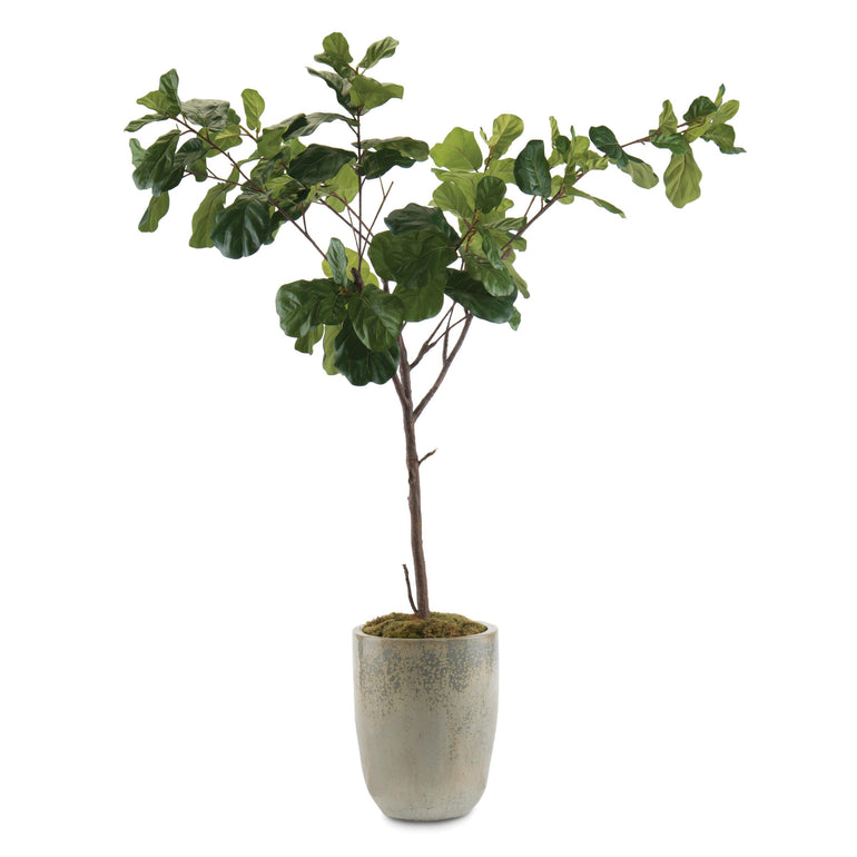 A fiddle leaf fig is in a neutral, egg shaped, ceramic glazed urn.