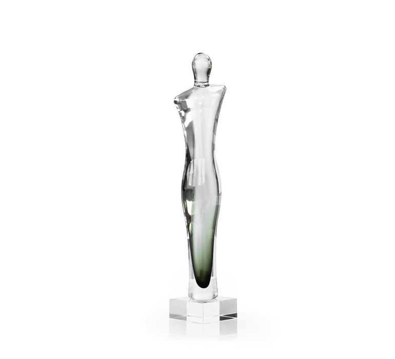 The Glass Silhouette Sculpture is a decorative tabletop accent that depicts the abstract silhouette of a human form. The piece is crafted from glass and stands atop a square crystal base.