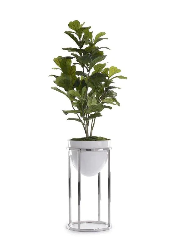 A fiddle-leaf fig tree and natural mood moss are in a glazed white metal insert inside a transitional stand with a nickel finish.