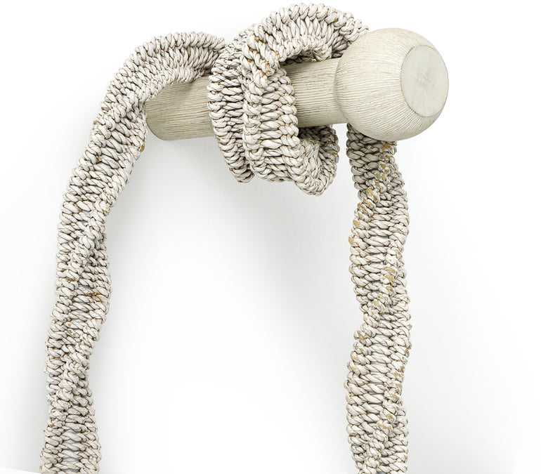 Hand-woven lampakanay rope wrapped over a metal frame in a whitewash finish complete with a whitewash finished wood dowel for mounting. Plug-in pendant with an average cord length of 22 feet. Coordinates with the Jaden white collection.