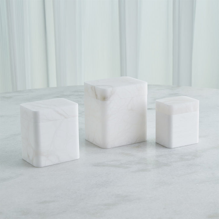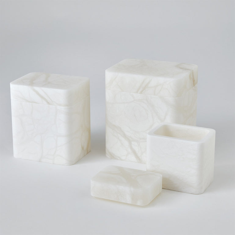 Handcrafted Italian rectangular alabaster boxes and tray with rounded corners. As alabaster is a natural product, there will always be variations in veining and color making each piece unique.