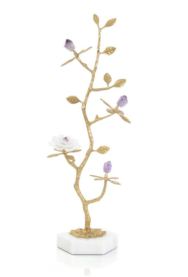 Inspired by the beautiful creations of mother nature, this gorgeous sculpture on a hexagonal base of marble takes the shape of a young tree sapling. Stunning brass branches stretch out from all sides, supporting flower buds of natural amethyst stone. A single flower with Selenite petals rests on one of the lower branches, matching the marble base to complete the look.