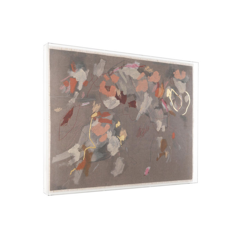 Strew by artist Maja Gunnarsdottir is a gorgeous giclee print on linen fabric with frayed edges. This abstract piece features tranquil tones of gray, pink, white, brown, and gold leaf. The piece is held within a clear acrylic box and may hang in both vertical and horizontal orientations.