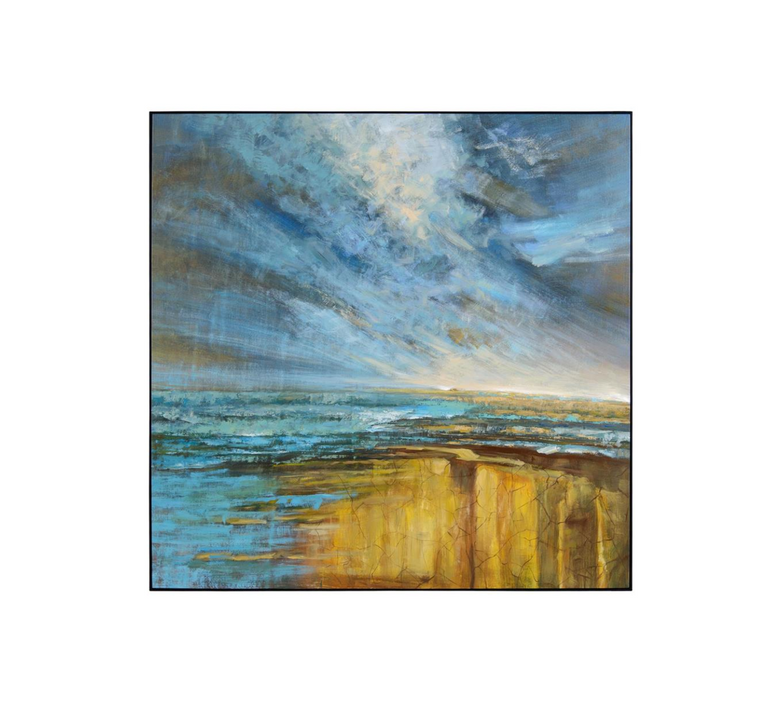 Teng Fei's original artwork is captured on canvas featuring a golden shoreline merging into a sea of blues and greens. It is framed in a simple black frame.