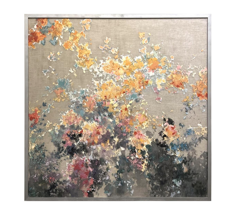 Vesper’s Glow by artist Teng Fei showcases a stunning explosion of color that creates an alluring focal point in any interior space. Created by hand with acrylic paint, the piece displays radiant shades of orange, yellow, pink and blue as they intermingle with the dark backdrop in black and gray. The piece is neatly secured within a square pinewood frame in a silver finish, imbuing the chromatic artwork with a splash of opulence.