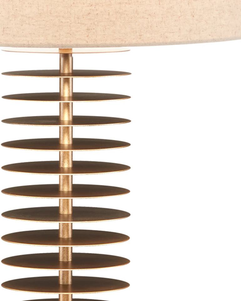 About the Walwyn Table Lamp, Ian Thornton explains he was eager to explore horizontal lines given lamp bodies are usually created from vertical lines: "The equally spaced 16 disks remind me of a skyscraper being built before the walls are put in place. This contemporary design will feel at home in any modern interior." The painted antique brass finish brings the gold table lamp added warmth, as does the slightly textural fabric of the shade