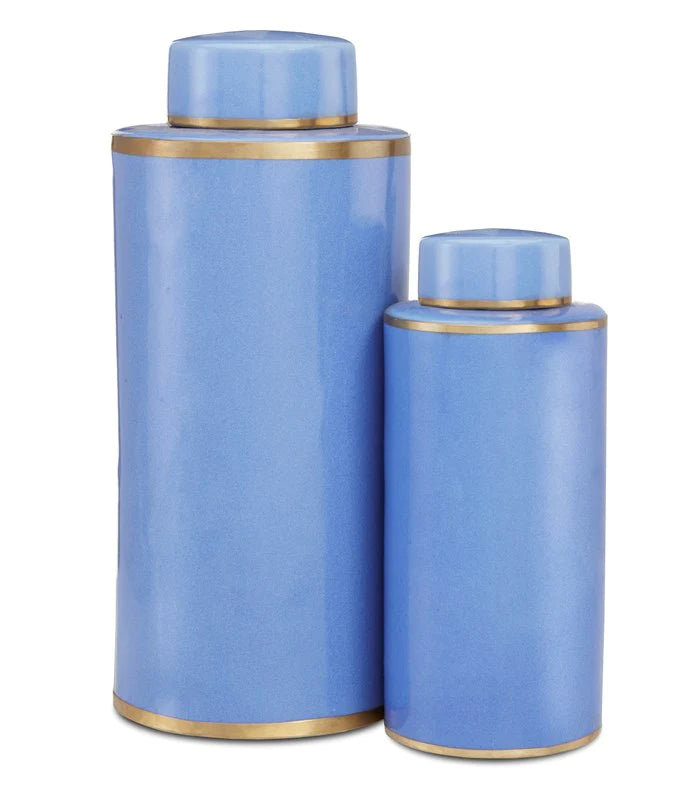 The Blue Tea Canister Set is a pair of hand-painted stoneware canisters in a bright blue reactive color with a delicate crackle running along the surfaces of both of the round decorative accessories. A sophisticated touch is added with the brass rings that are affixed to the stoneware vessels. We offer this design in several patterns and in a number of solid colors.