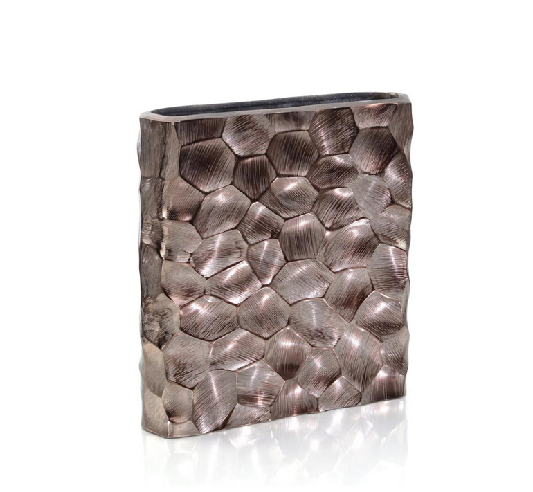 The Gravar Vase is a stunning accent piece that greatly enhances a space with its earthy Bronze hue. A textural marvel with a robust square shape, the aluminum piece is enveloped head to toe in curvaceous grooves with textural brush marks that contribute an excess of depth. A wonderful accent by itself, the Gravar Vase can also be arranged alongside its alternate variants to create a gorgeous custom display.