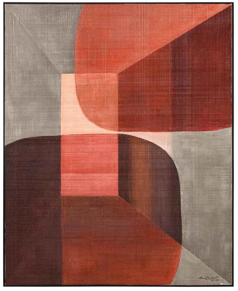 Sections of red allow a peek from blush in this original painting by LM Zhou. The piece is surrounded by a simple black molding.