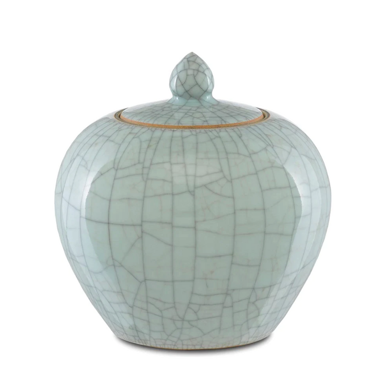 The hand-thrown porcelain body of the Maiping Ginger Jar covered with a celadon crackle glaze has been baked and given a light thermic shock to create the crackled lines in the texture. Some lines on the pale green jar are darkened with real tea leaves while others are covered with black calligraphy ink to create depth in the porcelain. We have a number of designs in this family of accessories.