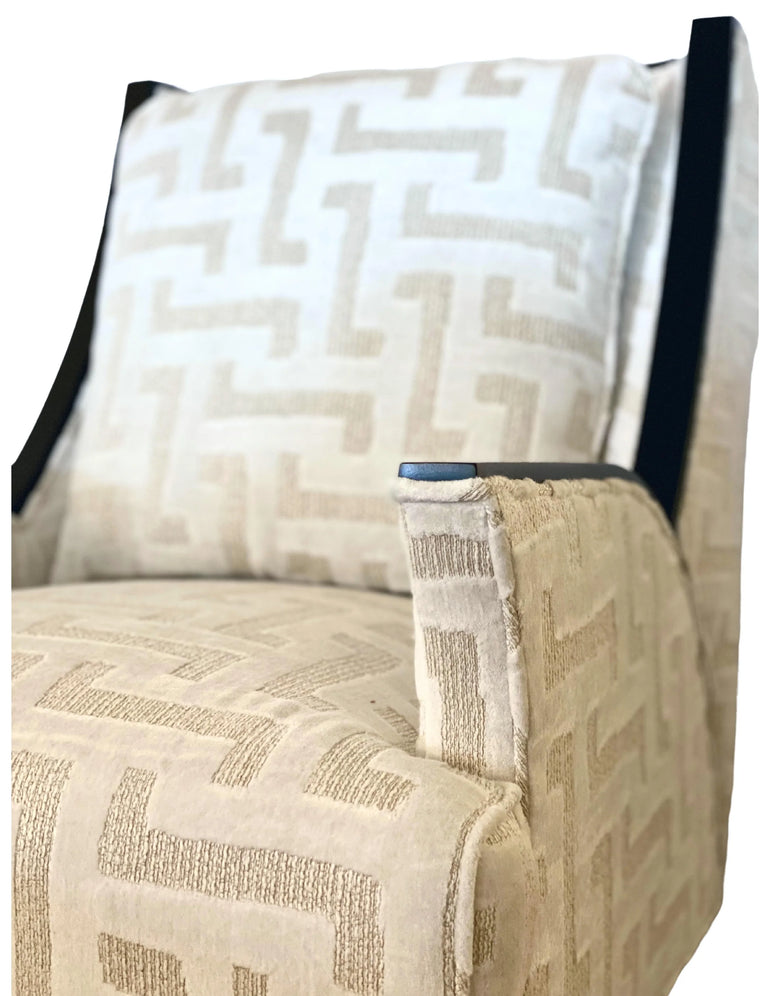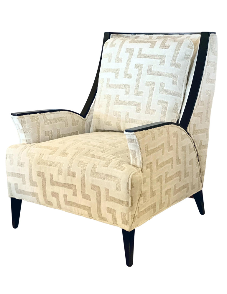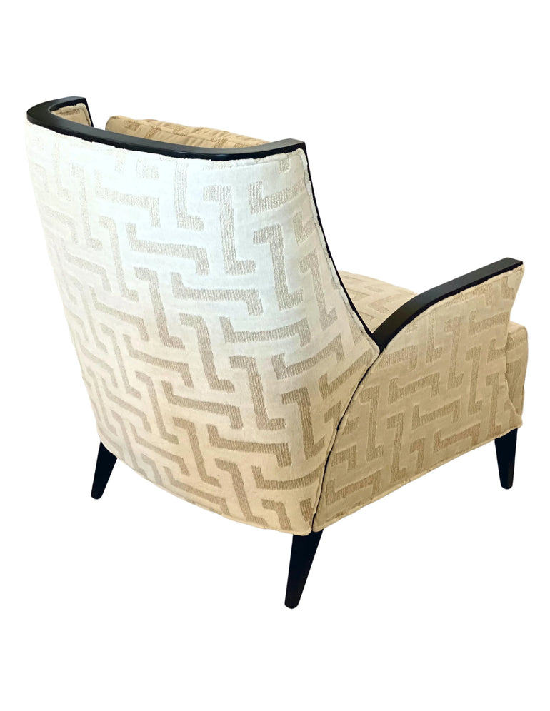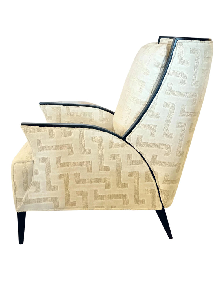Inspired by Art Deco furniture, this lounge chair includes Beech wood trim that creates swooping arcs on the arms, sides and top back. An attached seat supports a loose knife edge pillow back. The chair is raised on tall tapering legs.