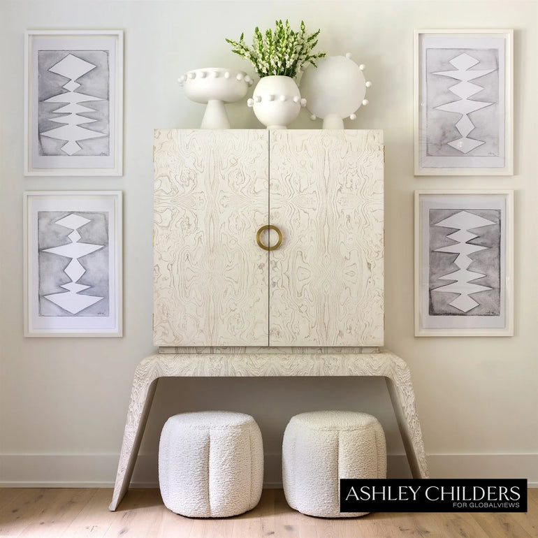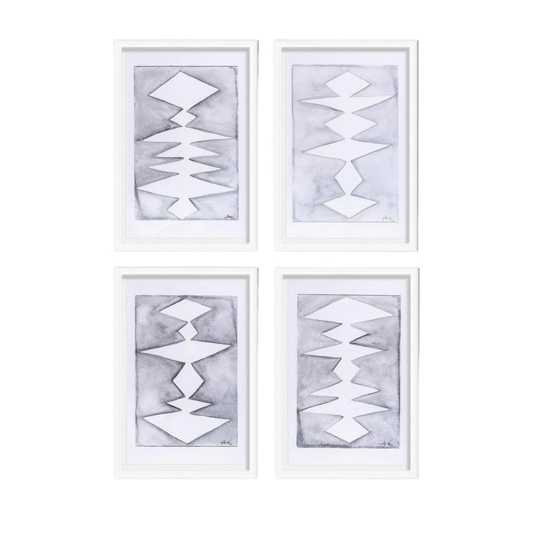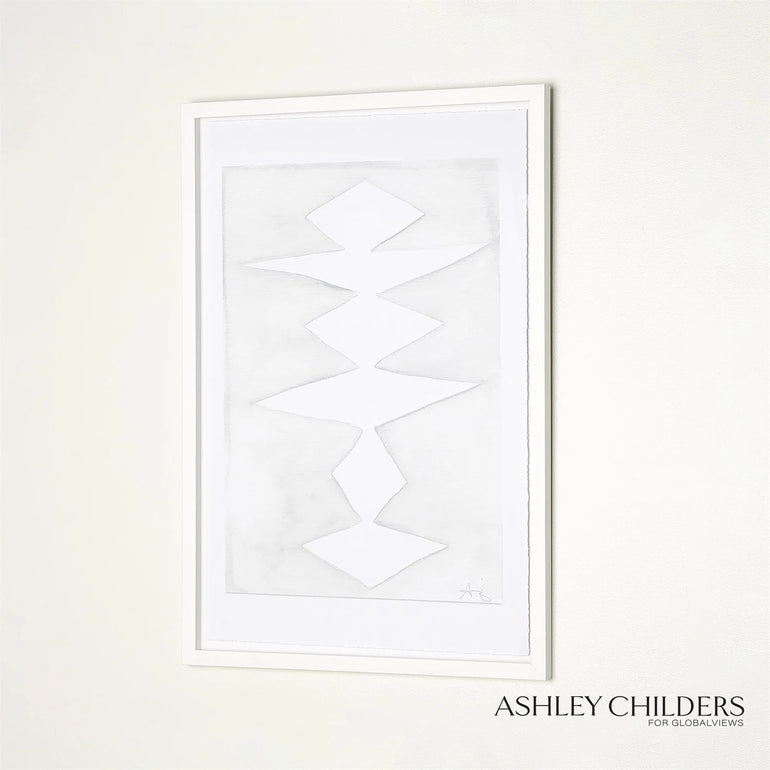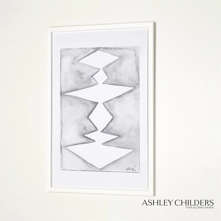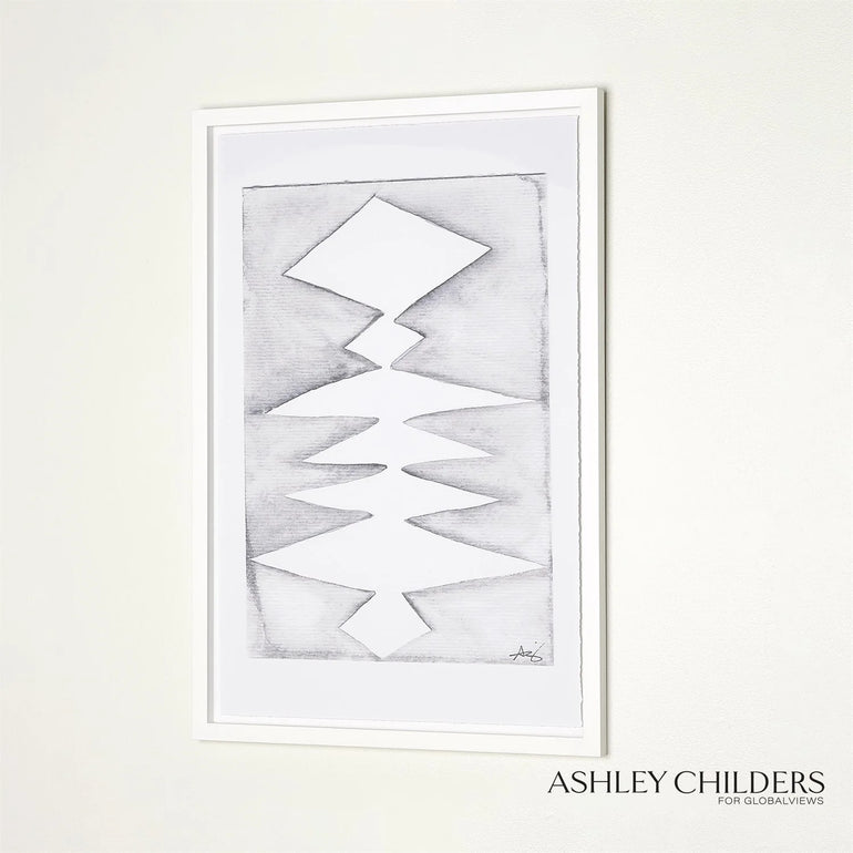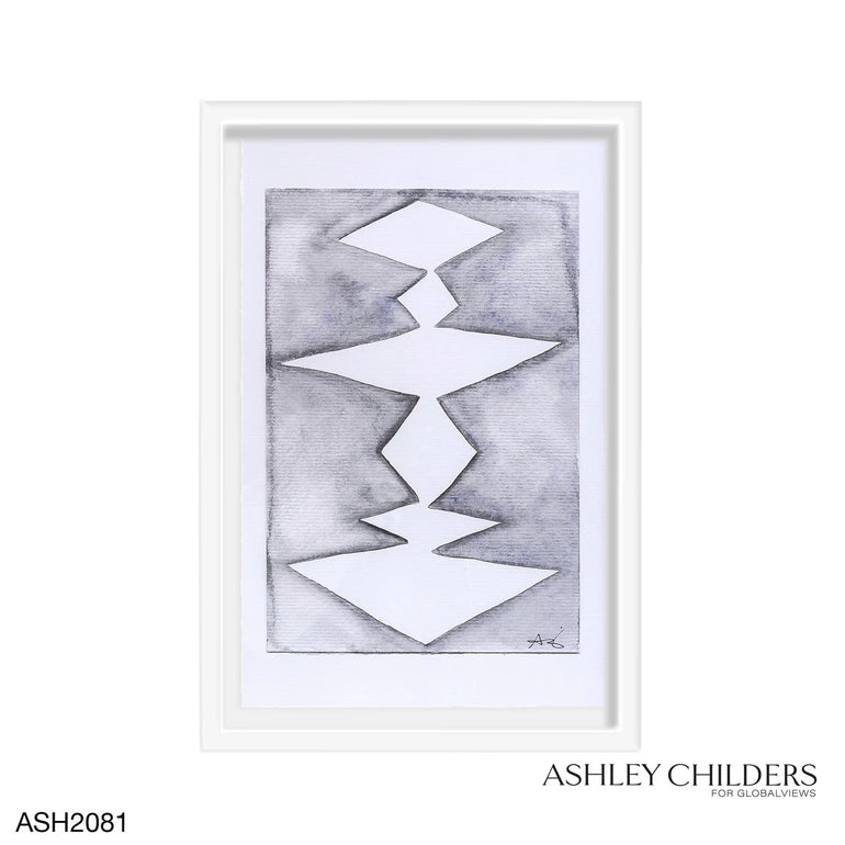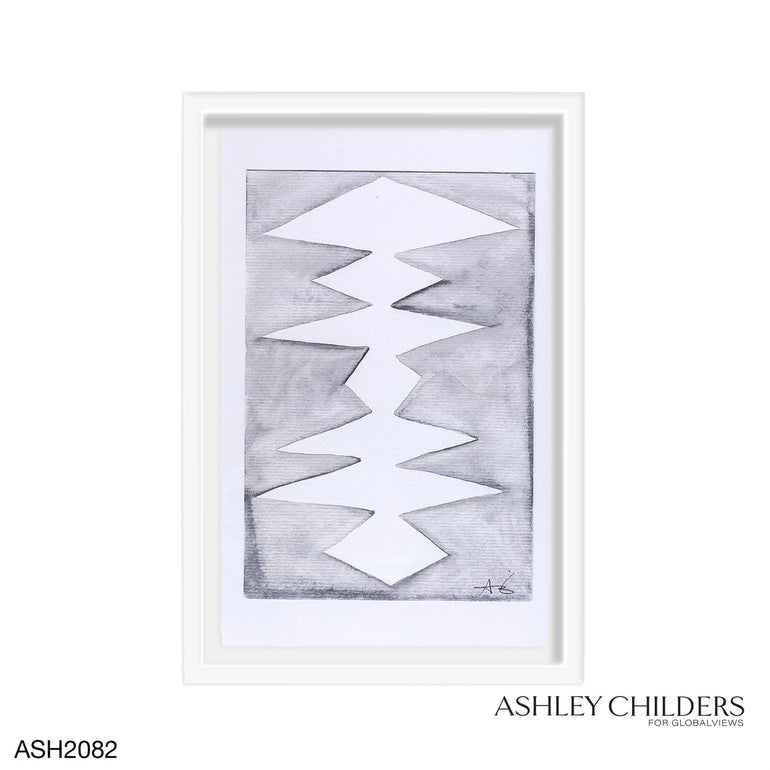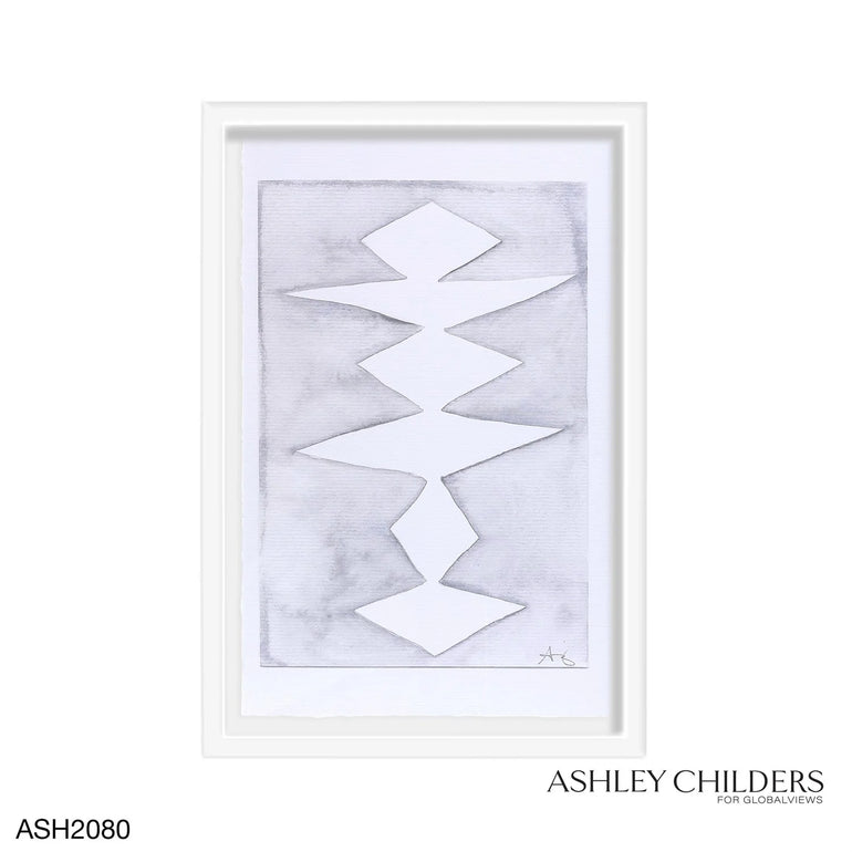 Ashley Childers used a watercolor relief technique to create the Peaks Collection. Abstract shapes and painterly strokes are printed on deckled edge paper. Framed in a modern white shadowbox, the collection makes an artistic statement as a set or as standalone pieces.