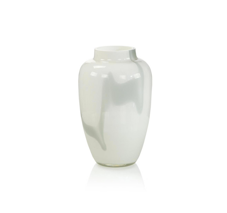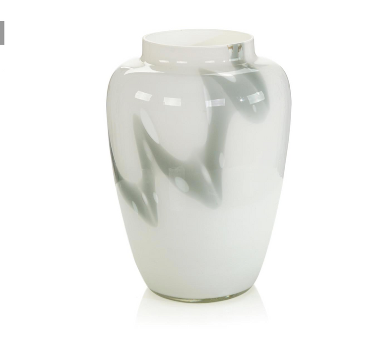 Polished handblown glass vase with abstract whisps of grey smoke dancing around the vessel. Smoke grey design will very from piece to piece