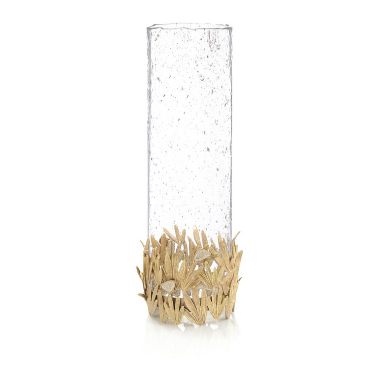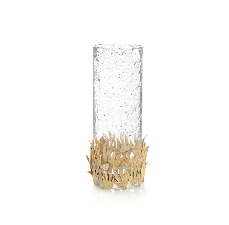 The Sunrise Hurricane is a lovely accessory for introducing an energized, uplifting quality to your décor. A piece of rounded glass is gently nestled within a polished brass base with an enamel finish. Radiant flora elegantly bloom around the piece, completing the look.