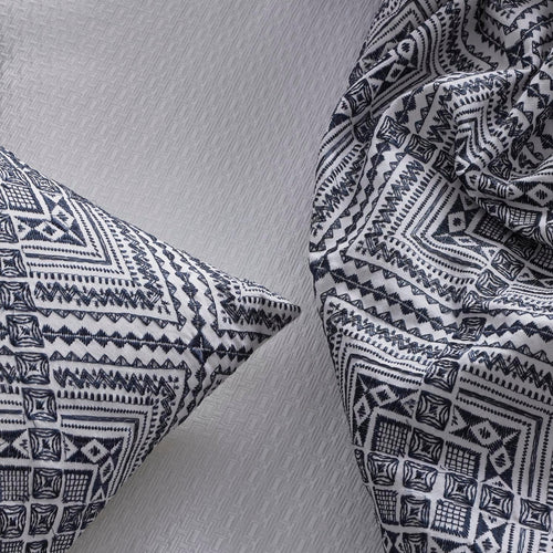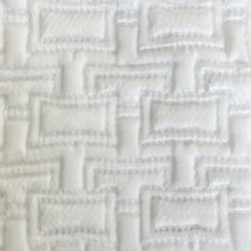 Modern jacquard, featuring tiny rectangles superimposed over each other, tailored to perfection. This design is bold enough to pair just with sheeting, but also works beautifully as a foundation for more decorative collections featuring embroidery or a pattern. Sophisticated, versatile and low maintenance.