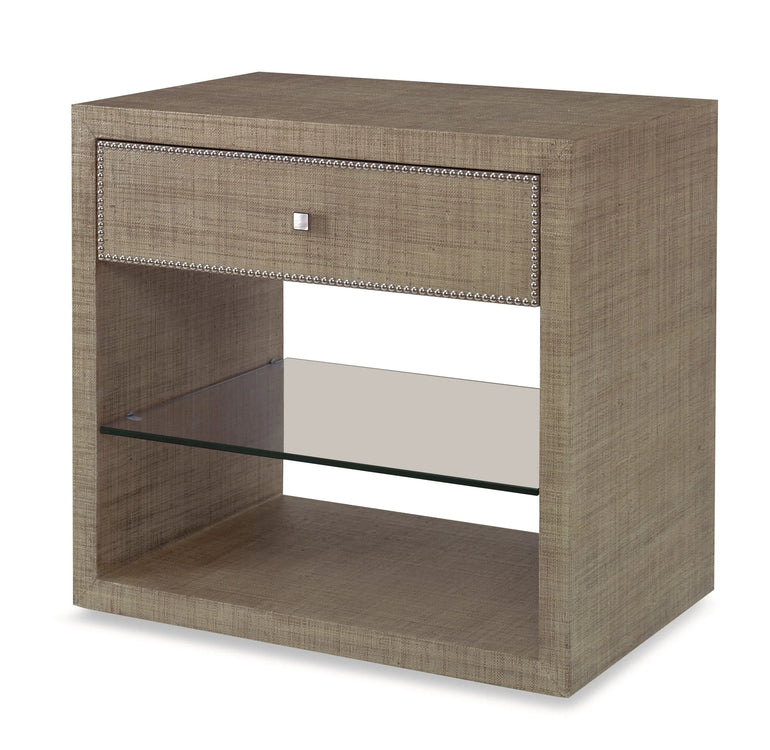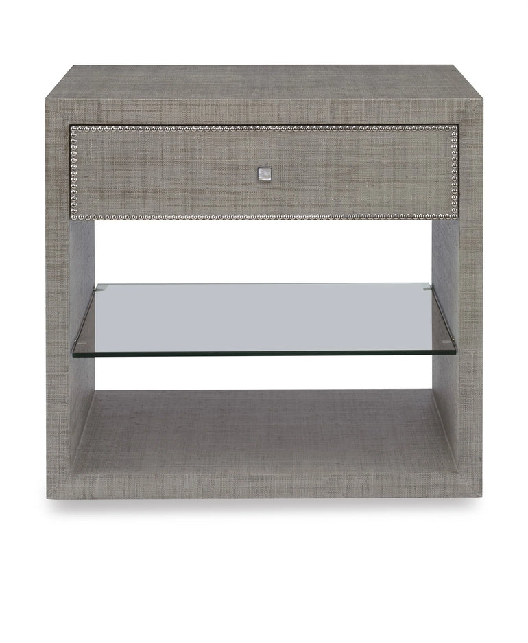 Single soft-close drawer with chrome plated hardware above removable tempered glass shelf