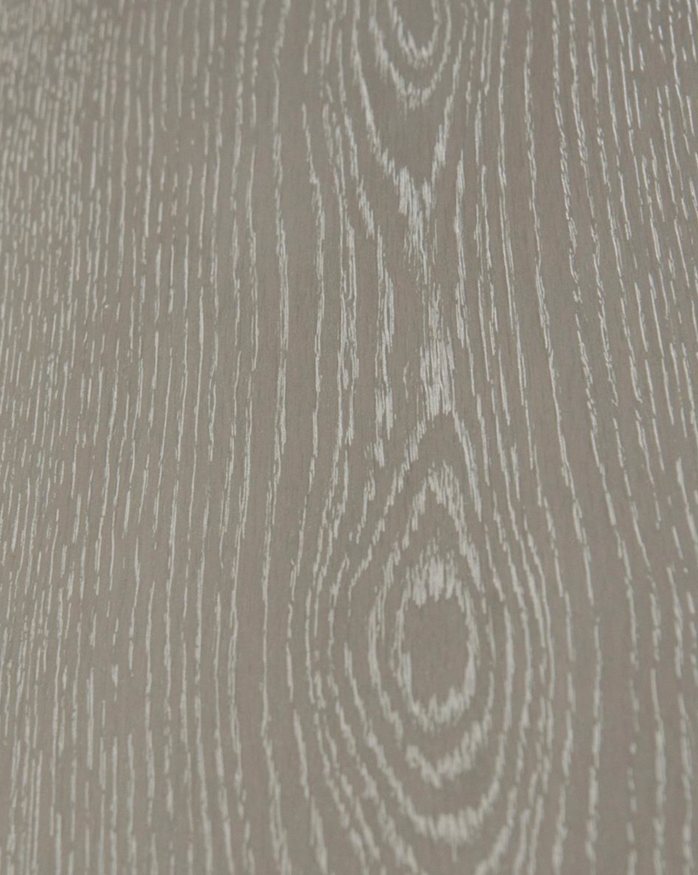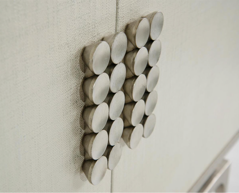 Encased in a grey oak veneer with a white linen and silver wash finish on the doors, this two-door cabinet has a unique pair of concave disc handles in brushed steel that match the base.