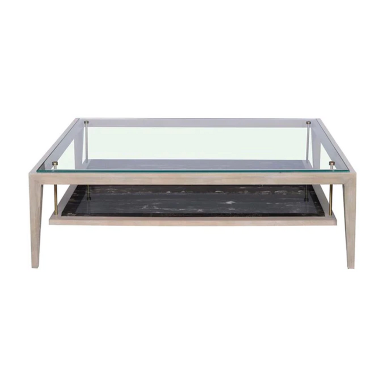 | Stone Shelf Suspended by Satin Brass Metal Rods and, Secured through Glass Top, Black Marble Shelf |