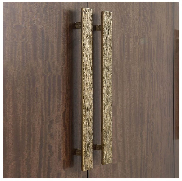 The Pedigree Four-Door Sideboard is a distinguished design that brings refined elegance to any space. Crafted from Movingue wood in a Maron finish, it showcases flowing grain patterns across four push-latch doors. Architectural trim in radiant Gold Coast tones frames the piece, while eight tapered legs feature matching gold accents with textural fluting. Dimensional Antique Brass handles provide subtle contrast to complete the look. Inside, three compartments each offer a single adjustable shelf for versatile storage.