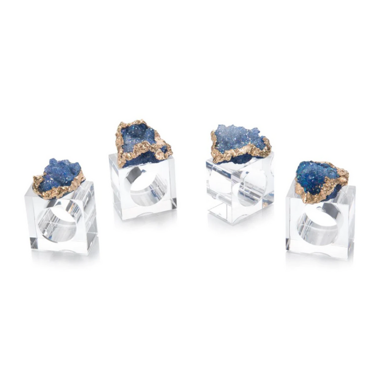 A set of four blue or white geodes with gold-plated edges sit atop crystal napkin rings. These napkin rings will create a lovely accent for your dinner table.
