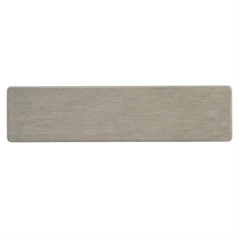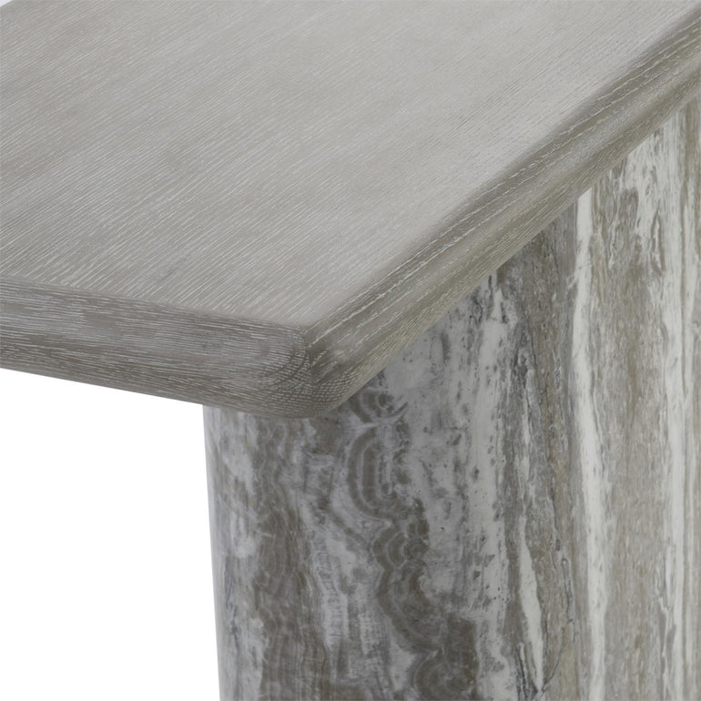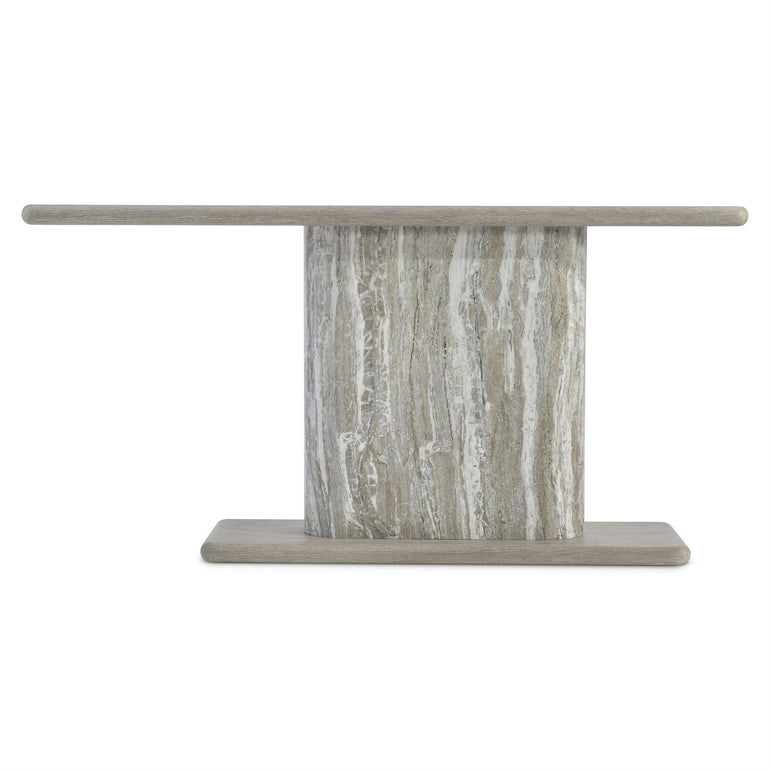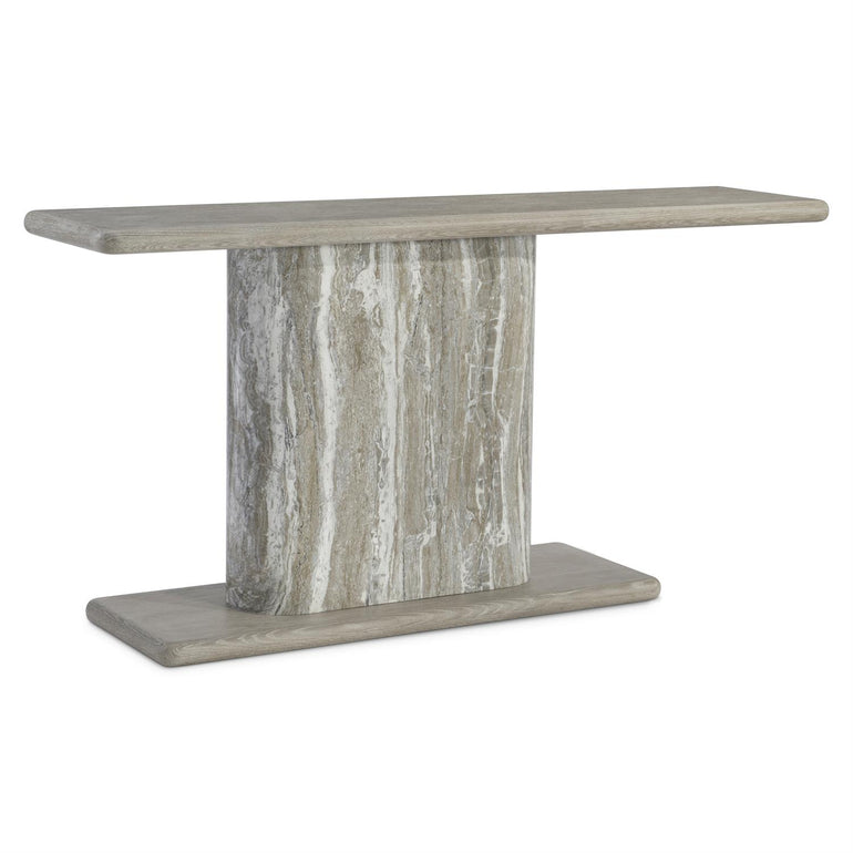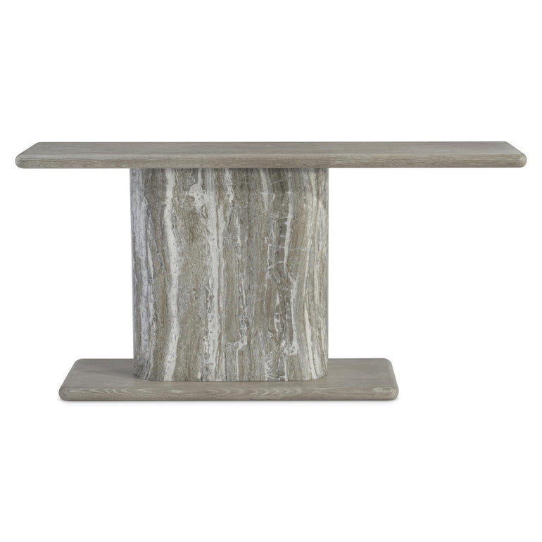 Organic drama is the signature of the Arcadia console table, with a monolithic faux stone pedestal base in Kalta finish. The column supports a cantilevered wire-brushed oak top in Clay finish and rests on a matching wood base.