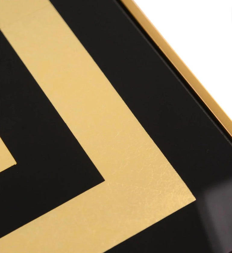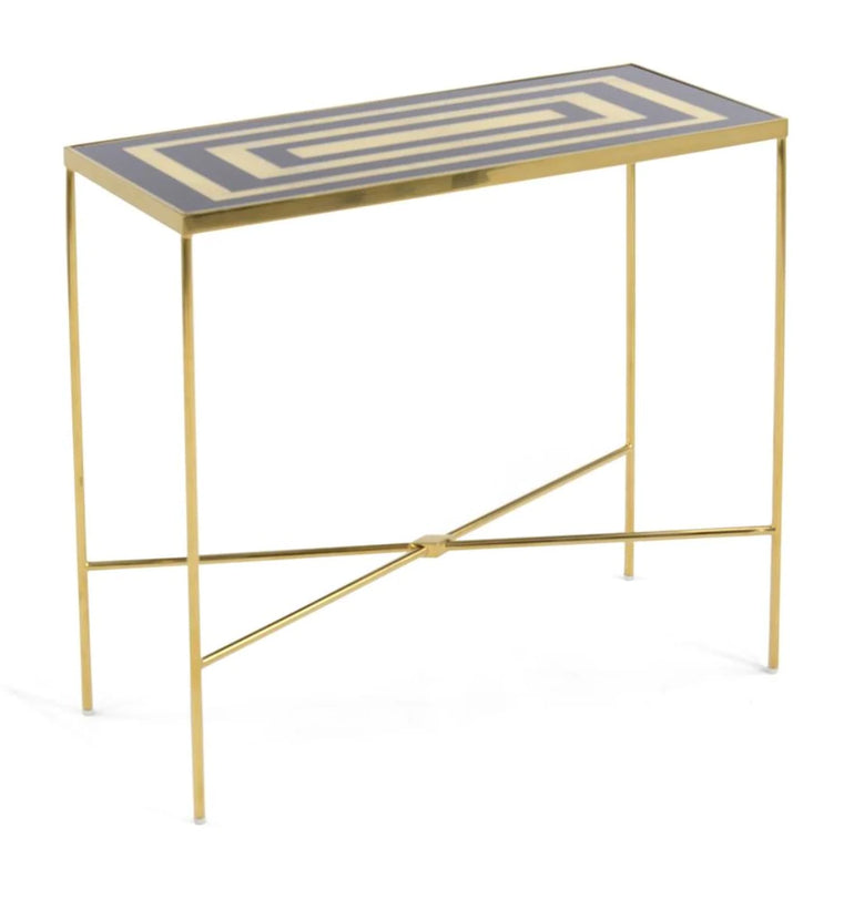 This elegant, stretchered end table in stainless steel with a polished brass finish has an inset top with alternating rectangles of gold églomisé and reverse-painted black glass.