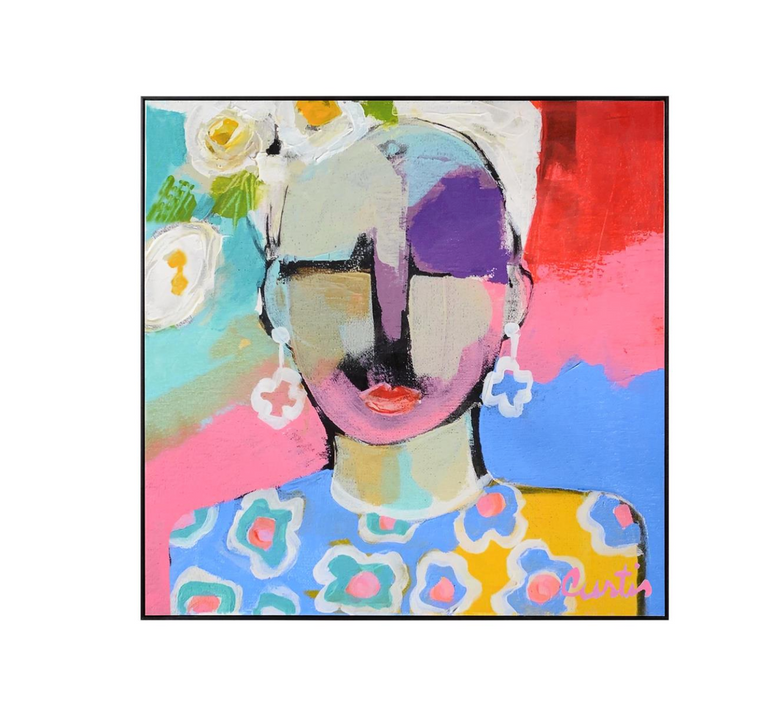 This glorious depiction of a majestic woman by artist Joan Curtis is displayed on a large canvas. The piece is surrounded by a wood molding.