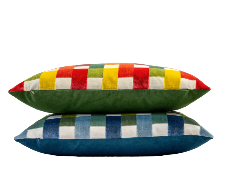 Elevate the style of any room with this luxurious, multi-colored tahiti plaid cut velvet pillow. Its elegant design and high-quality materials will make a statement in any home decor. Solid petrol blue velvet backer.