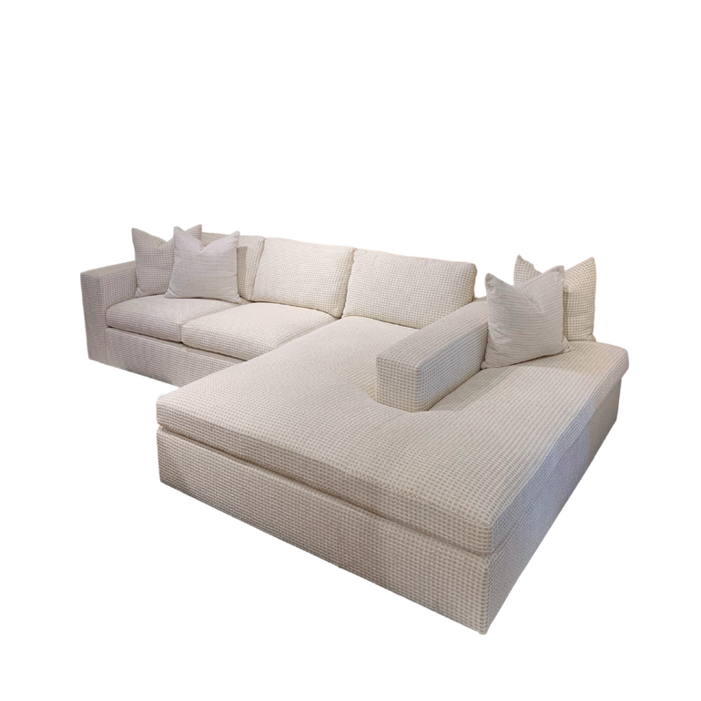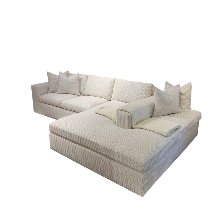 This double sided chaise features one side for lounging, and the other side as a bench or extra seating. Two throw pillows accompany the piece.
