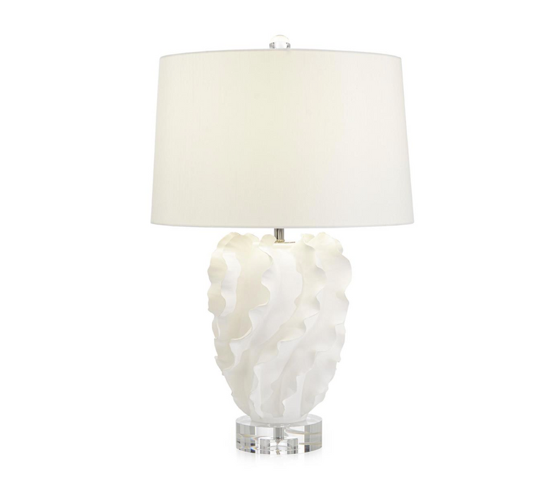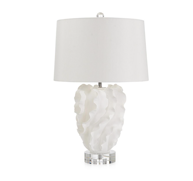 The Balza Table Lamp is a gorgeous statement piece that creates a breezy atmosphere through delicate flourishes and serene color palette. Crafted from porcelain, the body showcases a flowing scalloped pattern that is complemented by a thick, rounded base of clear acrylic with matching ball finial. The slender, metallic hardware is adorned in a Polished Nickel finish, granting opulent tones to this stunning turnkey lamp.