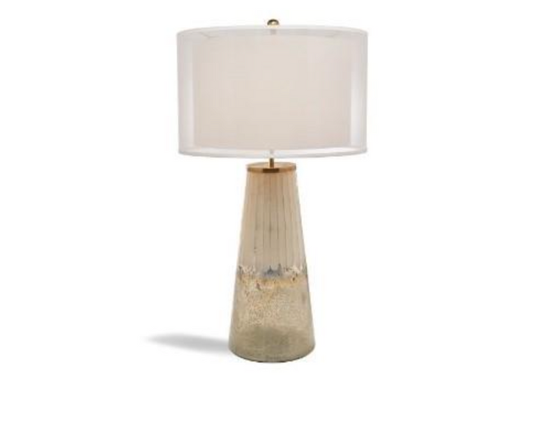 The Casey Table Lamp features a rich palette of texture that will greatly elevate the look and feel of an interior space. The body, expertly shaped from hand-carved glass, features a light grey hue with vertical striations that span the circumference, tapering out into a gorgeous mosaic-like display of black and gold textures that imbue any décor with a wealth of visual interest. A circular brass accent with a polished finish adorns the top of the piece, matching the neck and rounded finial, elevating the rustic feel of this turnkey lamp with a pristine metallic sheen.
