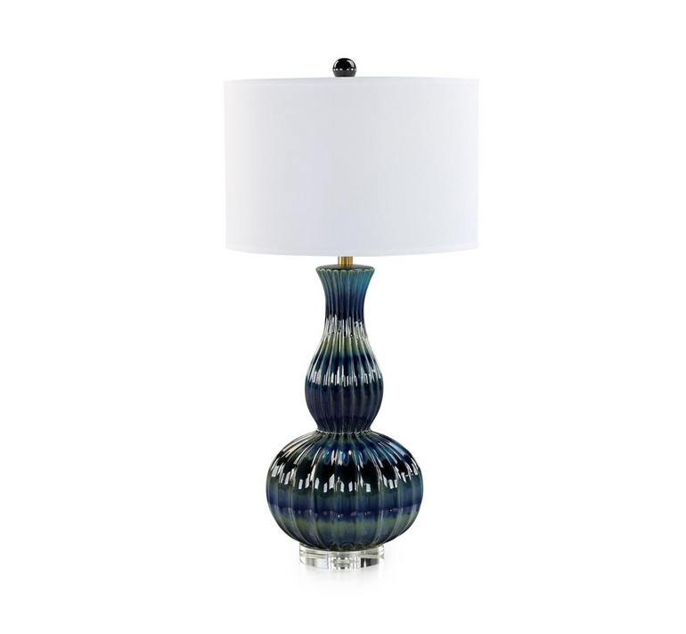 The Genevieve Table Lamp introduces elegant shapes and stunning ocean tones to an interior space. The curvy body of glazed ceramic showcases gorgeous channeling for a wealth of visual depth. The piece sits atop a round base of clear crystal, complemented by Polished Brass hardware and a black ball finial.