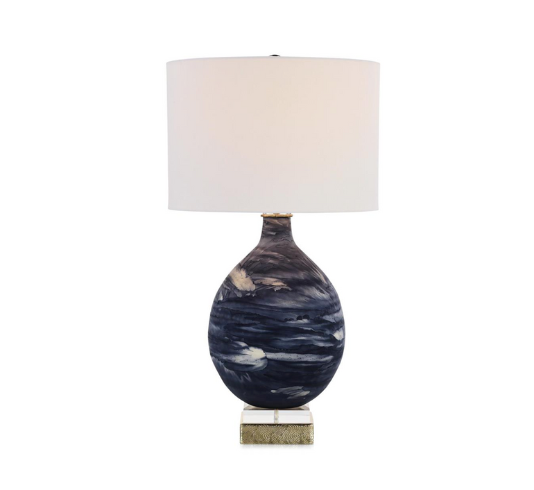 The Kyoto Table Lamp is a stunning piece that contributes a wealth of visual interest to any décor. Crafted from art glass, the piece displays swirling shades of blended blue and gray tones. The lamp rests atop a square steel base with swirling motifs in a Champagne finish, showcasing an acrylic accent to match the neck. The look is completed with a Champagne ball finial and a white drum shade.