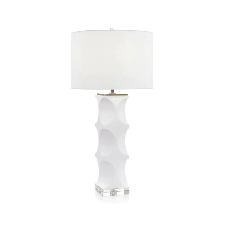 A modern, dimensionally carved table lamp is in chalky white and has an acrylic base.