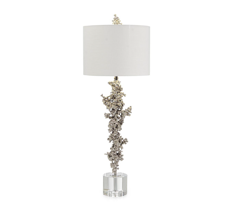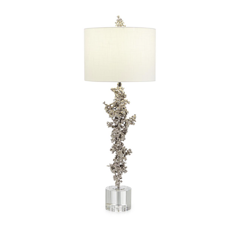 The Organic Opulence Table Lamp showcases an unpredictable organic shape with matching finial, introducing tasteful visual flair to an interior space. Plated in nickel, organic shapes and metallic hues coalesce to create a truly unique accent piece. A rounded crystal base creates playful juxtaposition with the metallic hues, resulting in a unique focal point for a wide variety of contemporary spaces. This piece features a three-way turnkey switch.