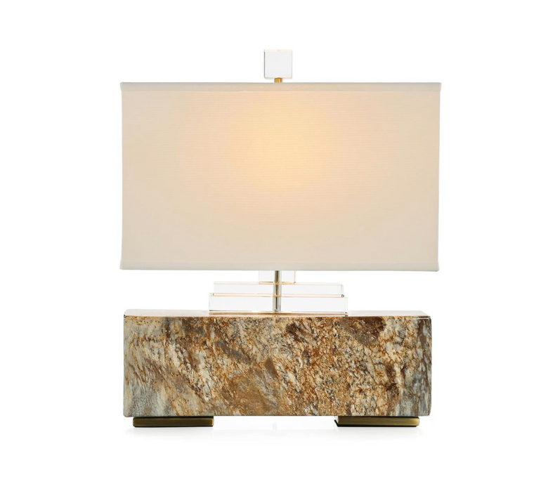 The Slab Table Lamp is a stylish design that showcases a wide variety of tones. The composite body features a rectangular shape and organic patterns, evoking the look of a cut stone slab. The piece rests atop two slender feet in a Bronze finish and displays multiple tiers of acrylic accents near the neck. The look is completed by Polished Nickel hardware, acrylic box finial, and a white linen box shade with rolled edges.