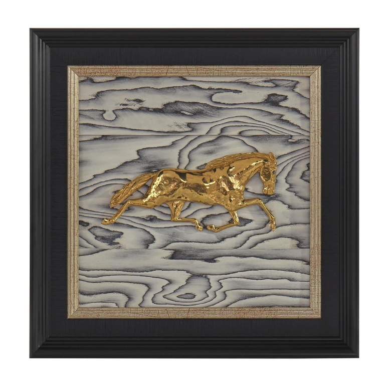 Hoofbeats in the Wind is an elegant wall panel featuring an intricately detailed Polished Brass horse mid-gallop, gracefully set against a dramatic black-and-white backdrop of ethereal, swirling waves. The dynamic composition is displayed in a molded black frame with a refined brass fillet, adding a touch of sophistication to the piece’s striking presence.