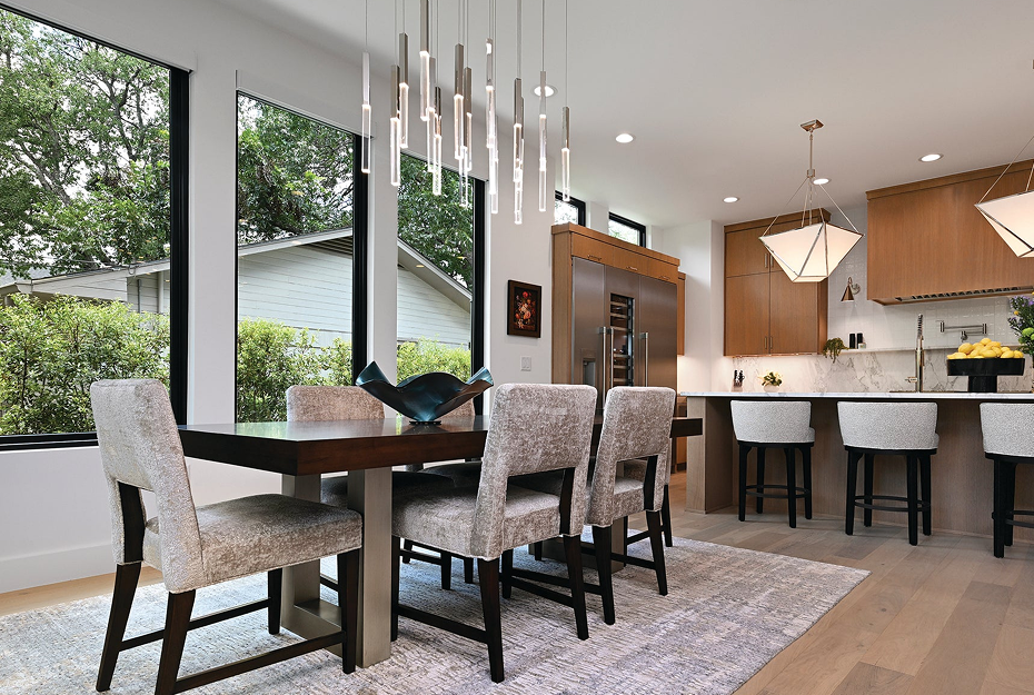 A sculptural mirror in the entryway sets the tone, while thoughtfully curated artwork brings vibrancy and dimension throughout. The open-concept kitchen and dining area was designed for effortless hosting, centered by a striking light fixture that elevates every gathering.
