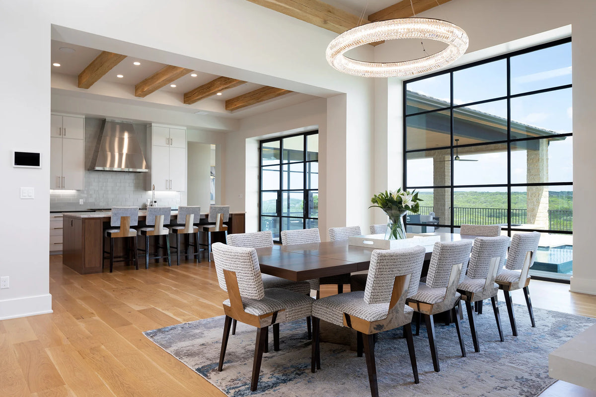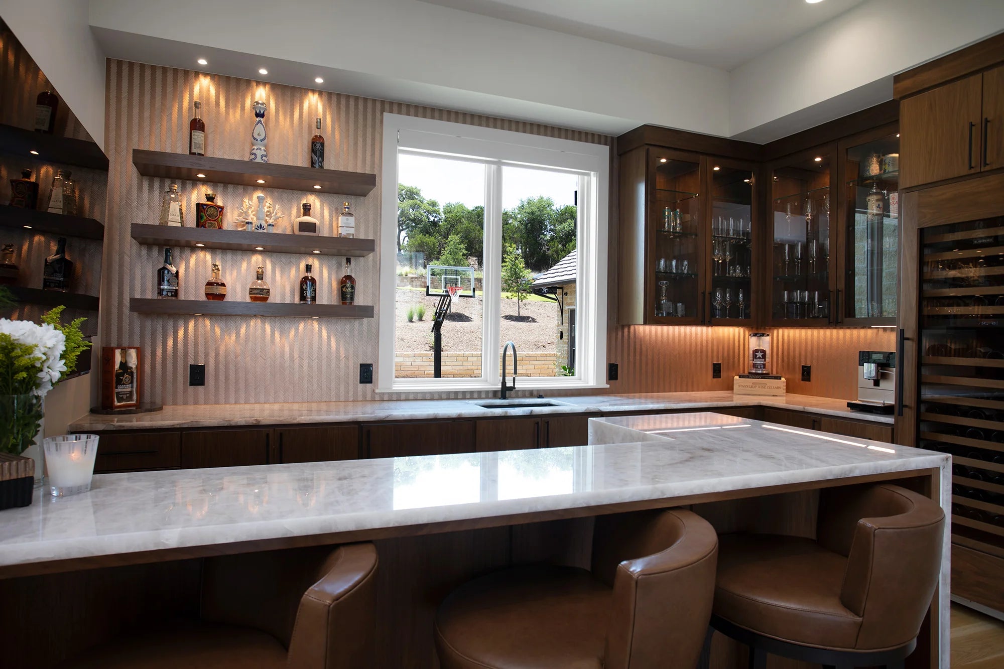 A show-stopping bar area serves as the heart of the home’s entertaining space, complete with undercounter lighting, backlit shelves, and a dedicated wine fridge. In the entryway, graphic wallpaper sets the tone with style and confidence. Throughout the open concept kitchen and dining area, bold light fixtures add a sculptural element, while black grid windows bring in natural light and architectural charm.