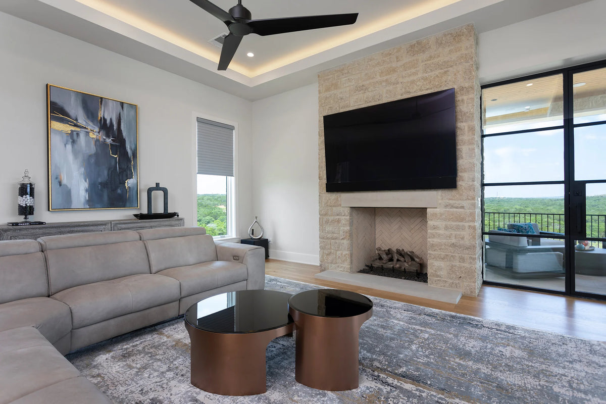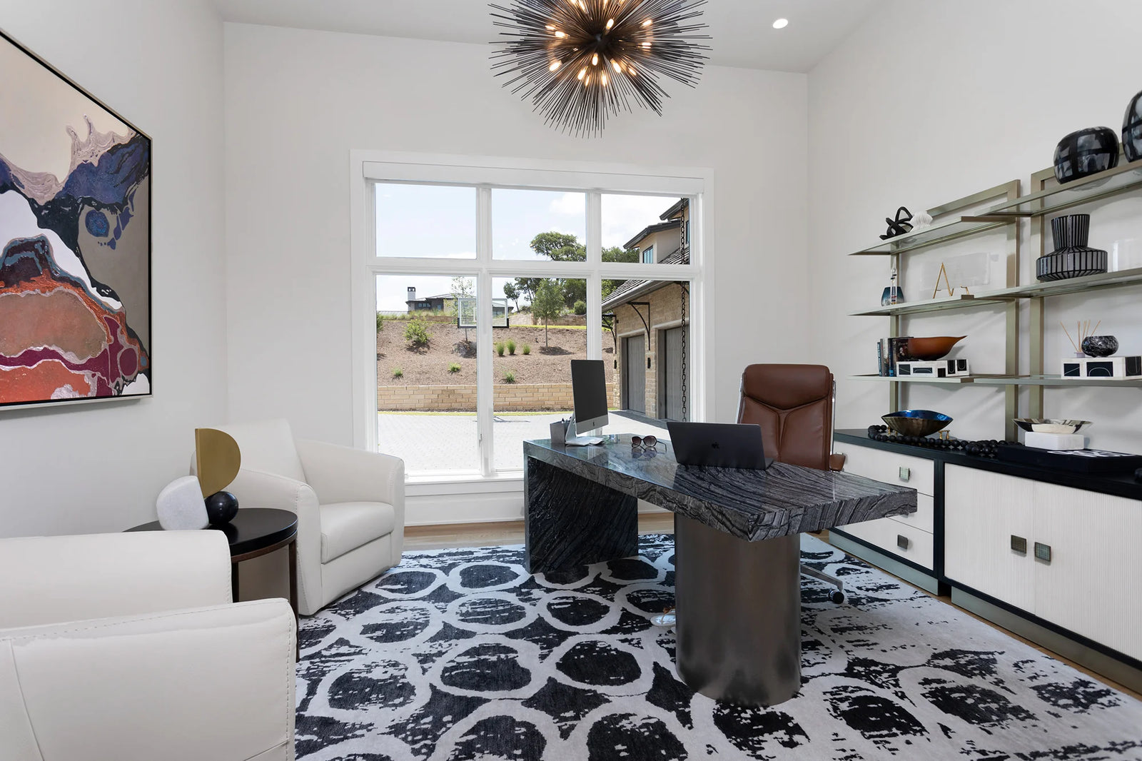 The living room features a brick fireplace that adds warmth and texture, while a sleek office space balances function and style. Each element was selected to create a cohesive yet surprising environment that reflects the client’s personal taste.