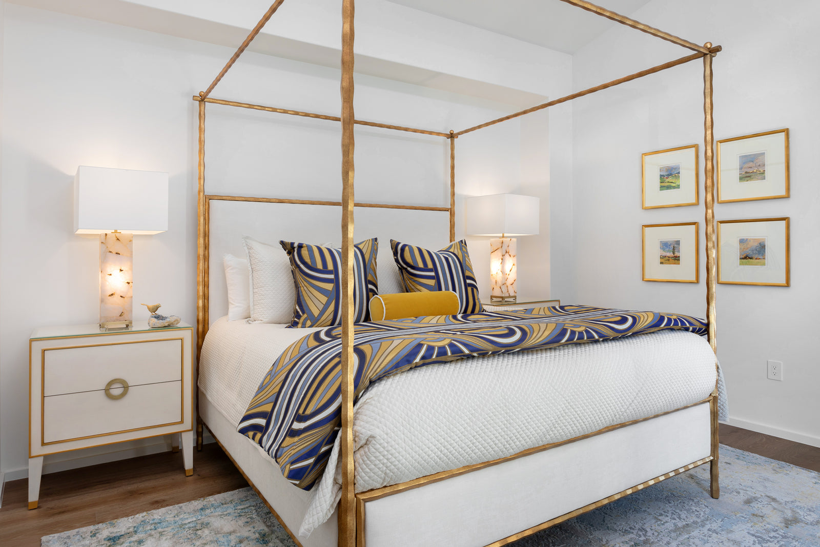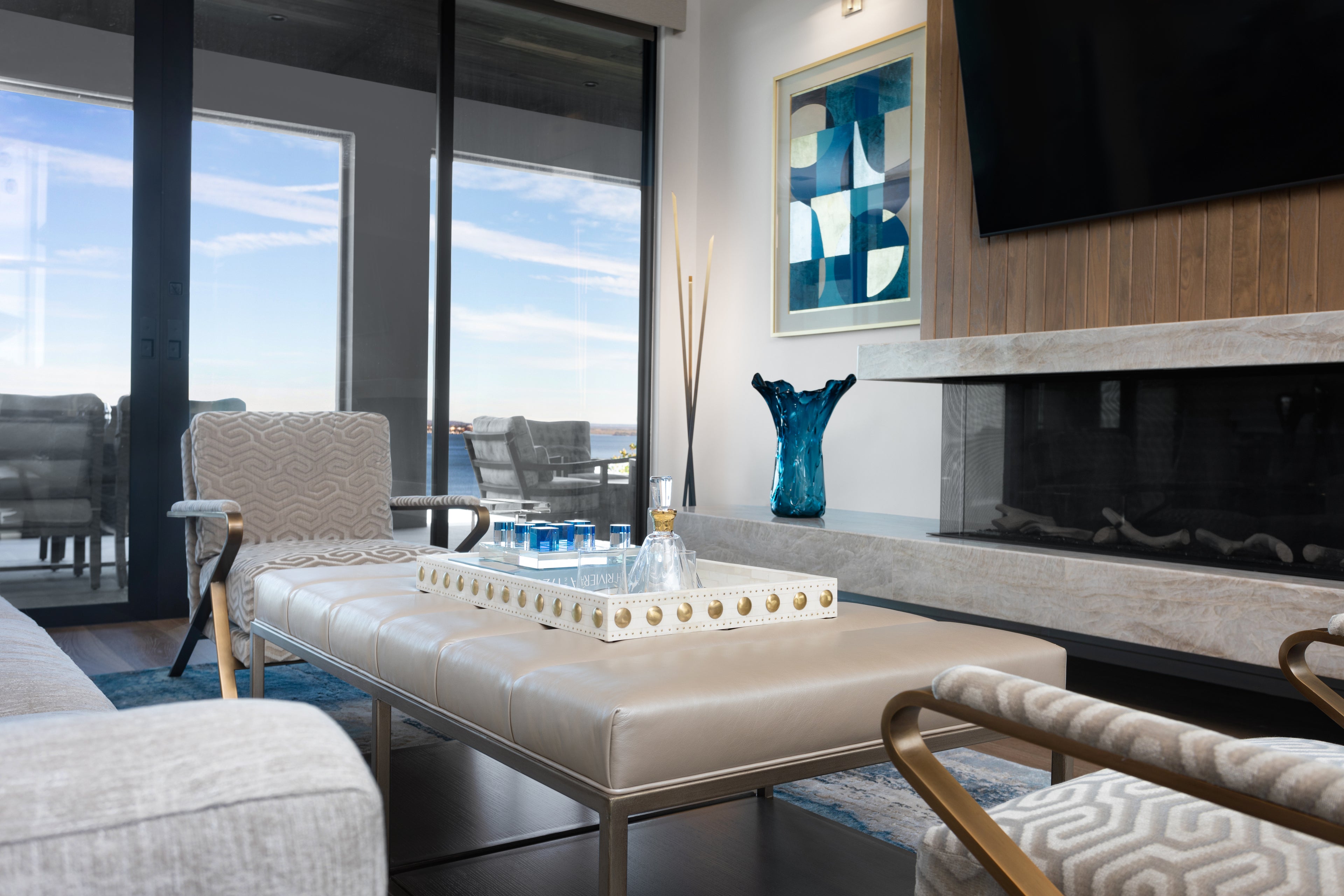Throughout the home, a neutral palette creates a calming backdrop while carefully chosen pops of blue echo the water just outside. From the intricate gold poster bed in the primary suite to the thoughtfully styled entry console, every detail feels intentional and elevated.