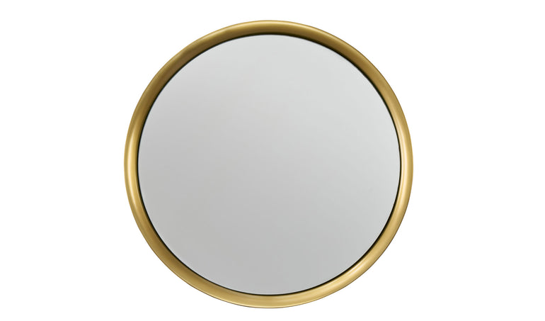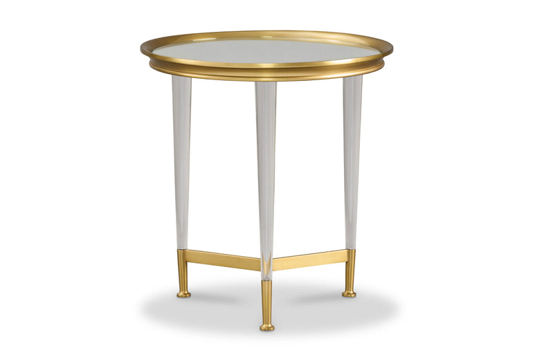 This spiffy round side table features a round mirror top with acrylic legs and gold trimming.