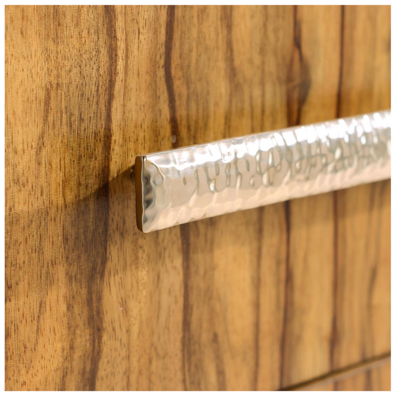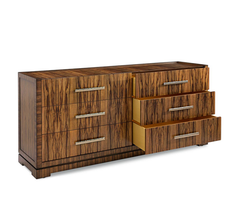 The Borneo Six-Drawer Chest is a stunning contemporary design showcasing untamed natural forms. Crafted from ofram and paldao woods, the piece displays two distinct grain patterns, with flowing abstract forms set against densely clustered straight lines to create striking visual contrast. Rectangular stainless steel handles in a White Brass finish accent each of the six soft-close drawers, enhancing the design with dimensional texture.