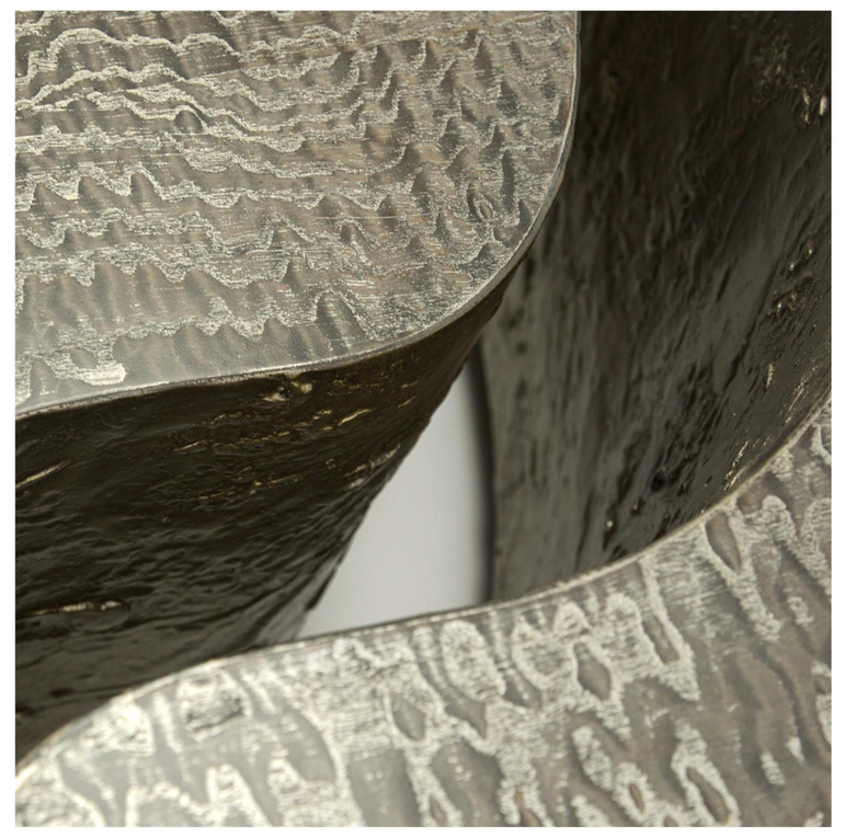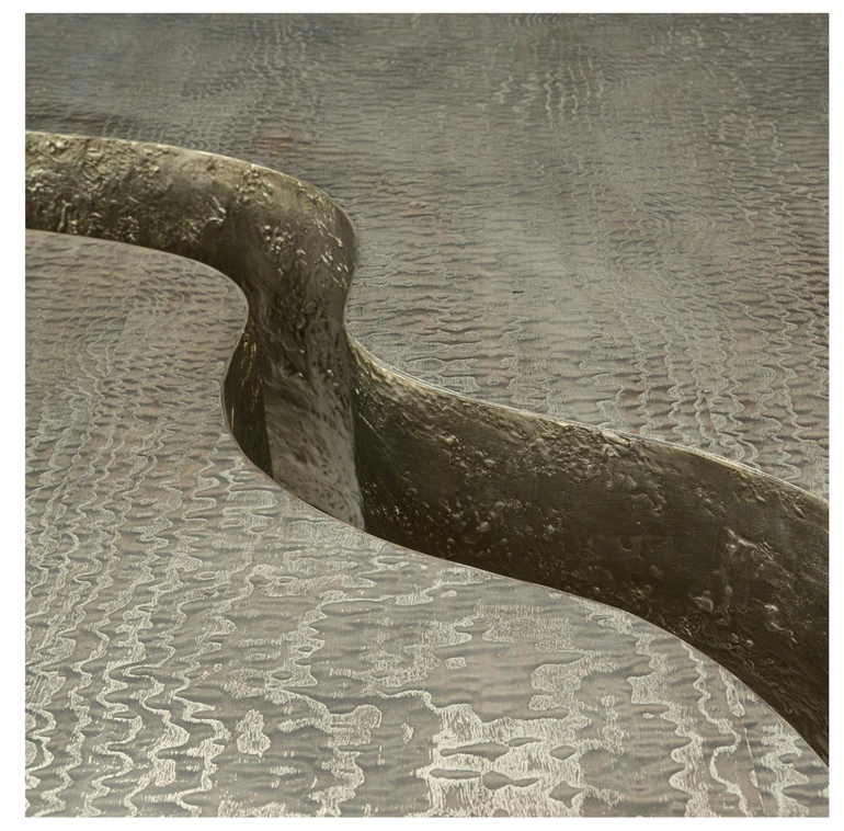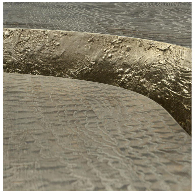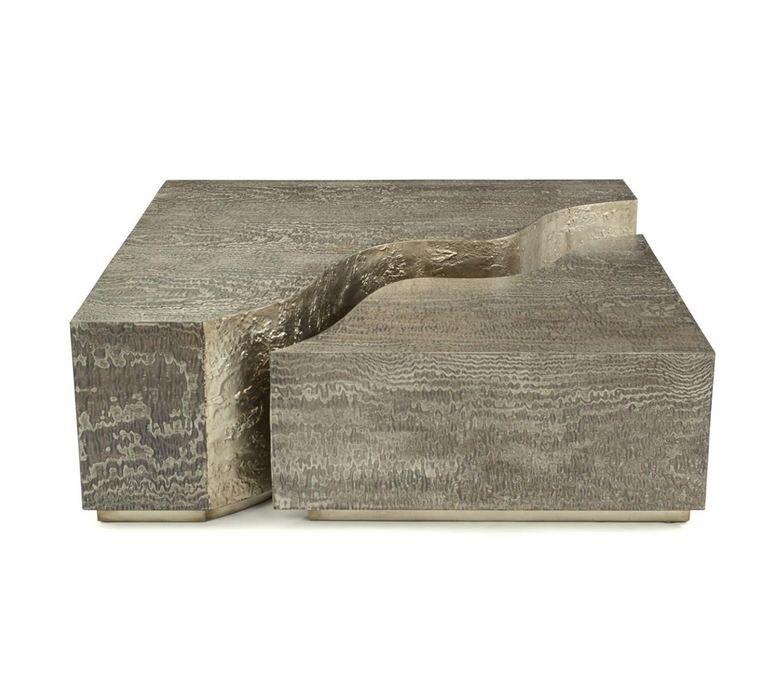 This architectural cocktail table features two pieces that fit together to create a contemporary bilevel effect. The sophisticated Silvered Tamo Ash veneer is enhanced with textured Burnished Silver Leaf along the split.