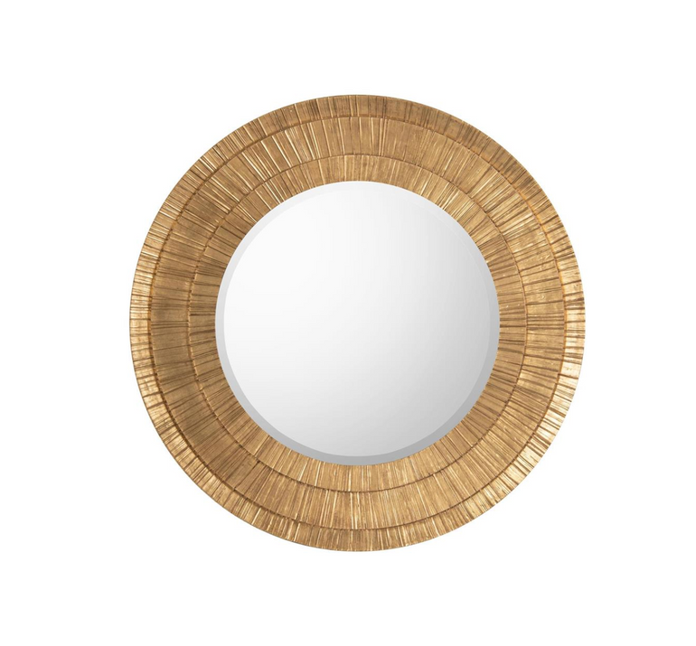 A three-tier frame in our gold coast finish surrounds a round, modern beveled mirror. French cleats are fitted.