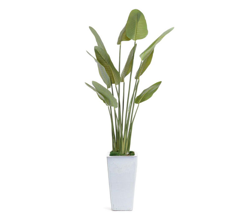 Towering birds of paradise in a white glazed garden pot topped with natural green preserved mood moss.